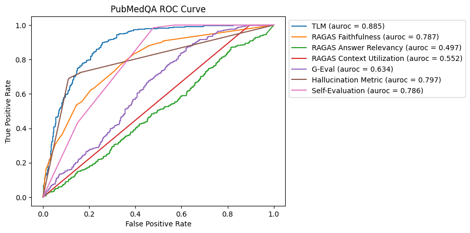 通过刚刚那份报告对比我们能知道,TLM(# Trustworthy Language Model)指标是一个很好的选择,只因它在各个数据集上的auroc值都很高。